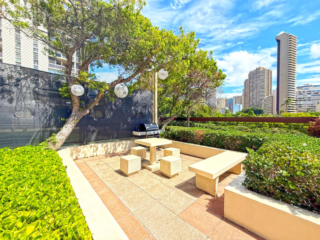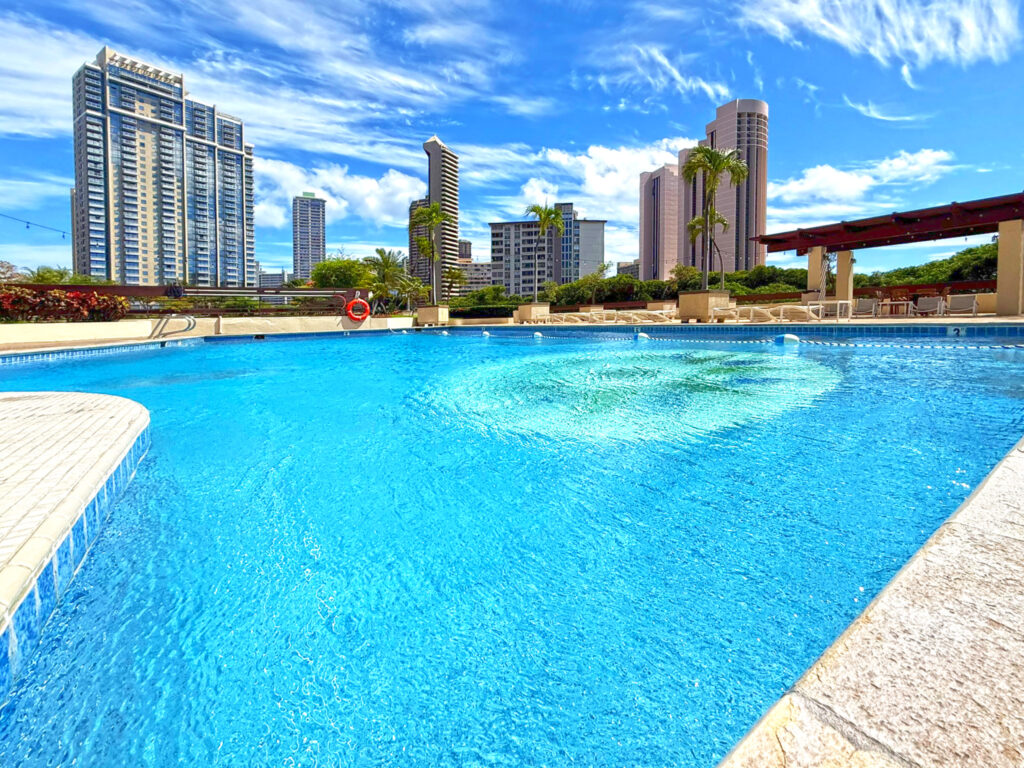 The resort-caliber amenity deck features a heated saltwater pool and whirlpool, BBQ pavilions, tennis/pickleball court, an open-air fitness area, recreation/party patio, guest parking, on-site security, and a resident manager. Steps to the sand and beach park paths, with world class shopping and dining next door at Ala Moana Center.
