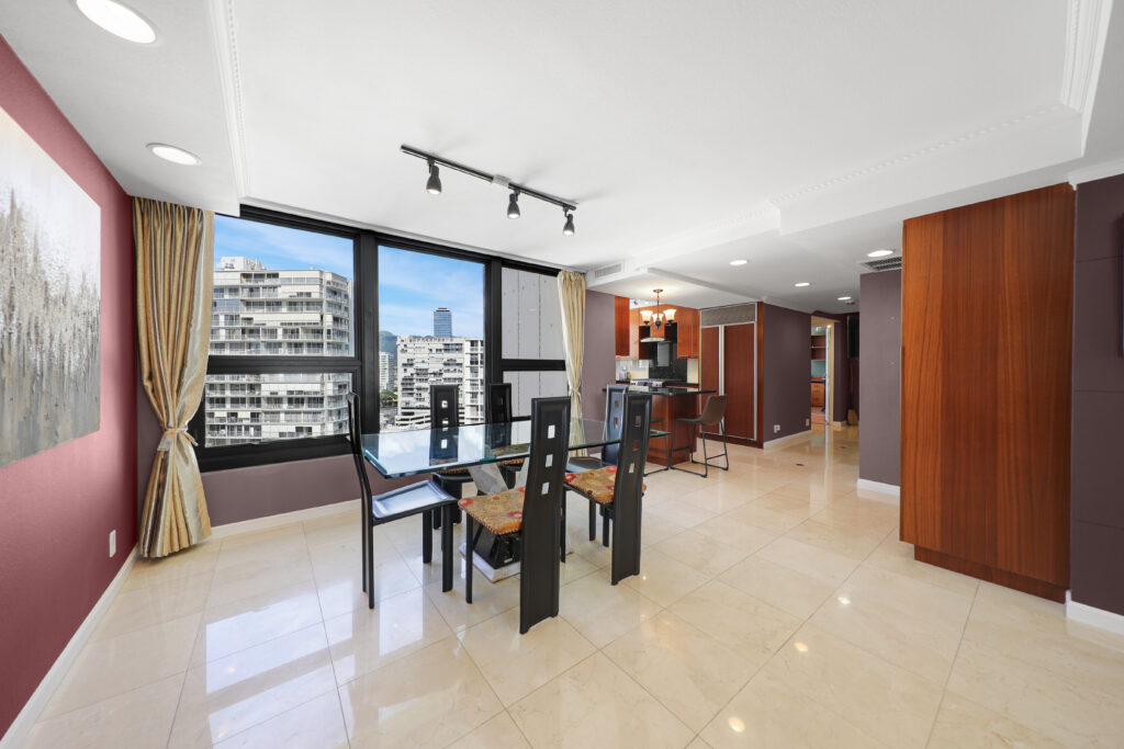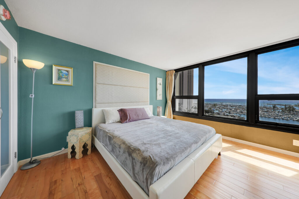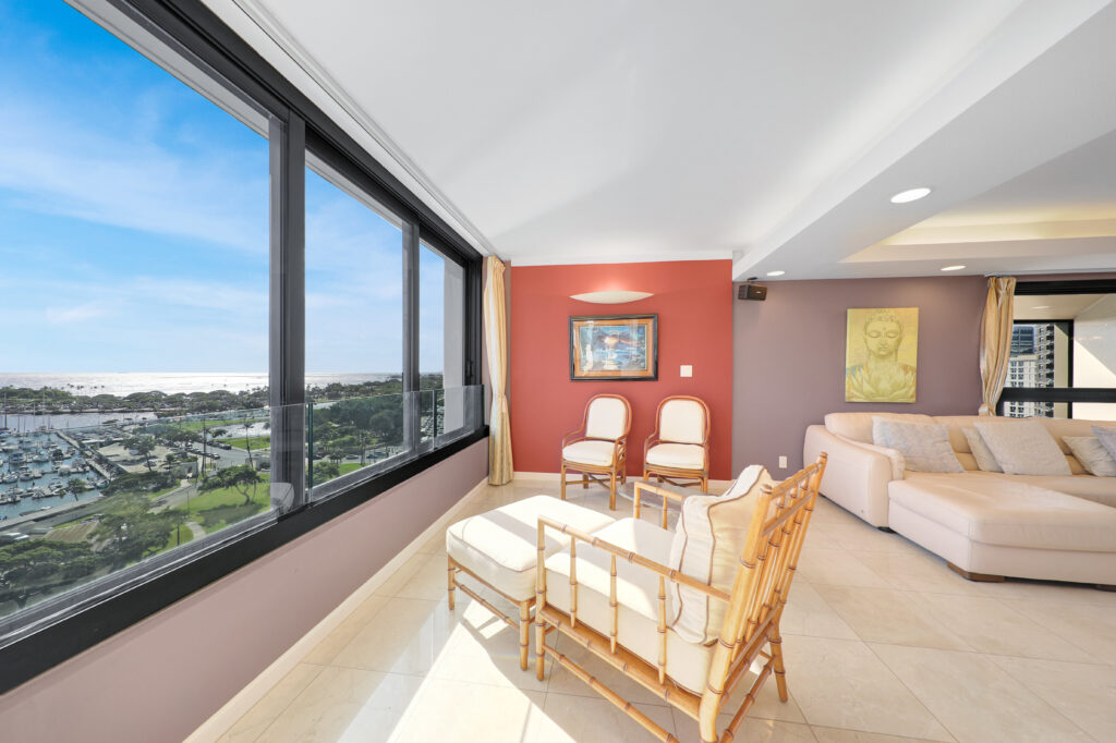 Commandingly set on the ocean side of Yacht Harbor Towers’ Diamond Head Tower, the coveted “01” corner stack frames Magic Island, ocean, coastline, yacht clubs, marinas, beaches, parks, mountains, and sunsets—ever-changing vistas from a true three-exposure residence. Steady trade-wind cross-breezes when you want them; quiet central A/C when you don’t.