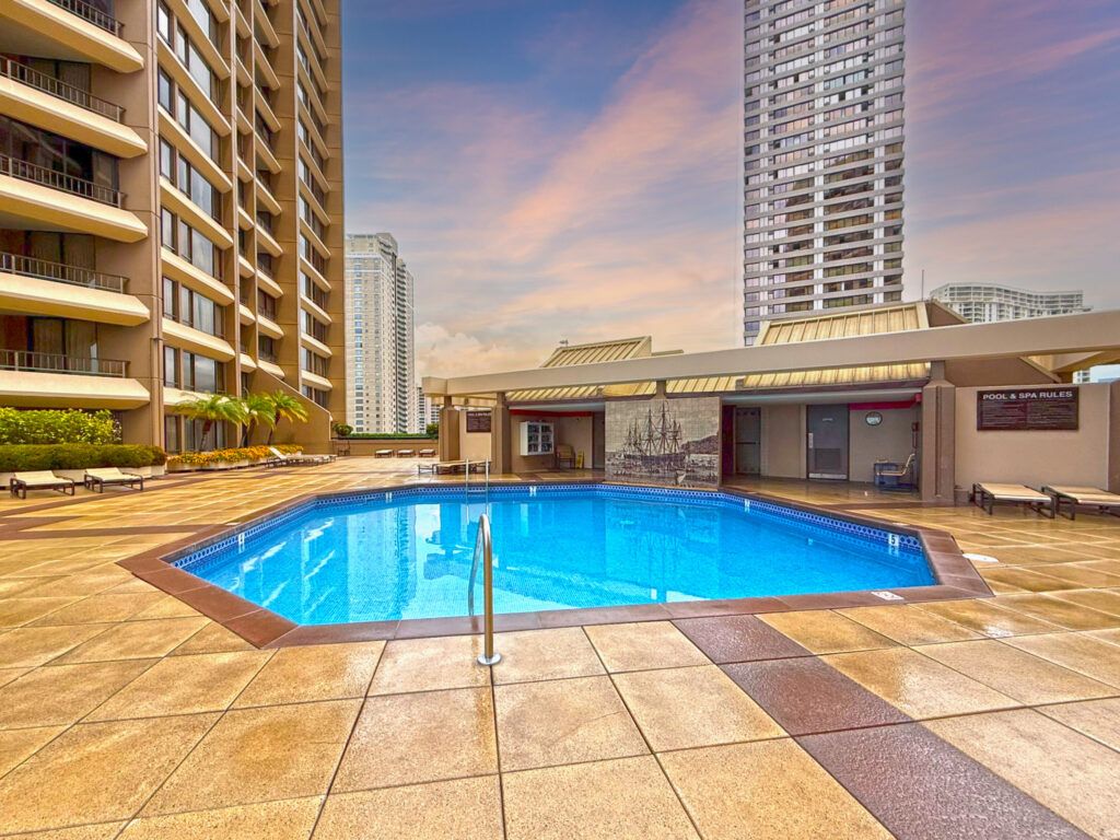 The interior is largely original and tenant-occupied, offering a rare value-add/fixer opportunity to reimagine the layout, modernize finishes, and unlock potential in a building prized for convenience. Discovery Bay provides resort-style amenities: outdoor pool, whirlpool, fitness rooms, BBQ patio, sun deck, secured entry, 24-hour security, on-site management, and commercial conveniences at street level. Unbeatable access to Ala Moana Center, Waikiki beaches, surf breaks, lagoon/marinas, dining, and all the energy of Waikiki – your chance to live, invest, or redesign in a prime Honolulu