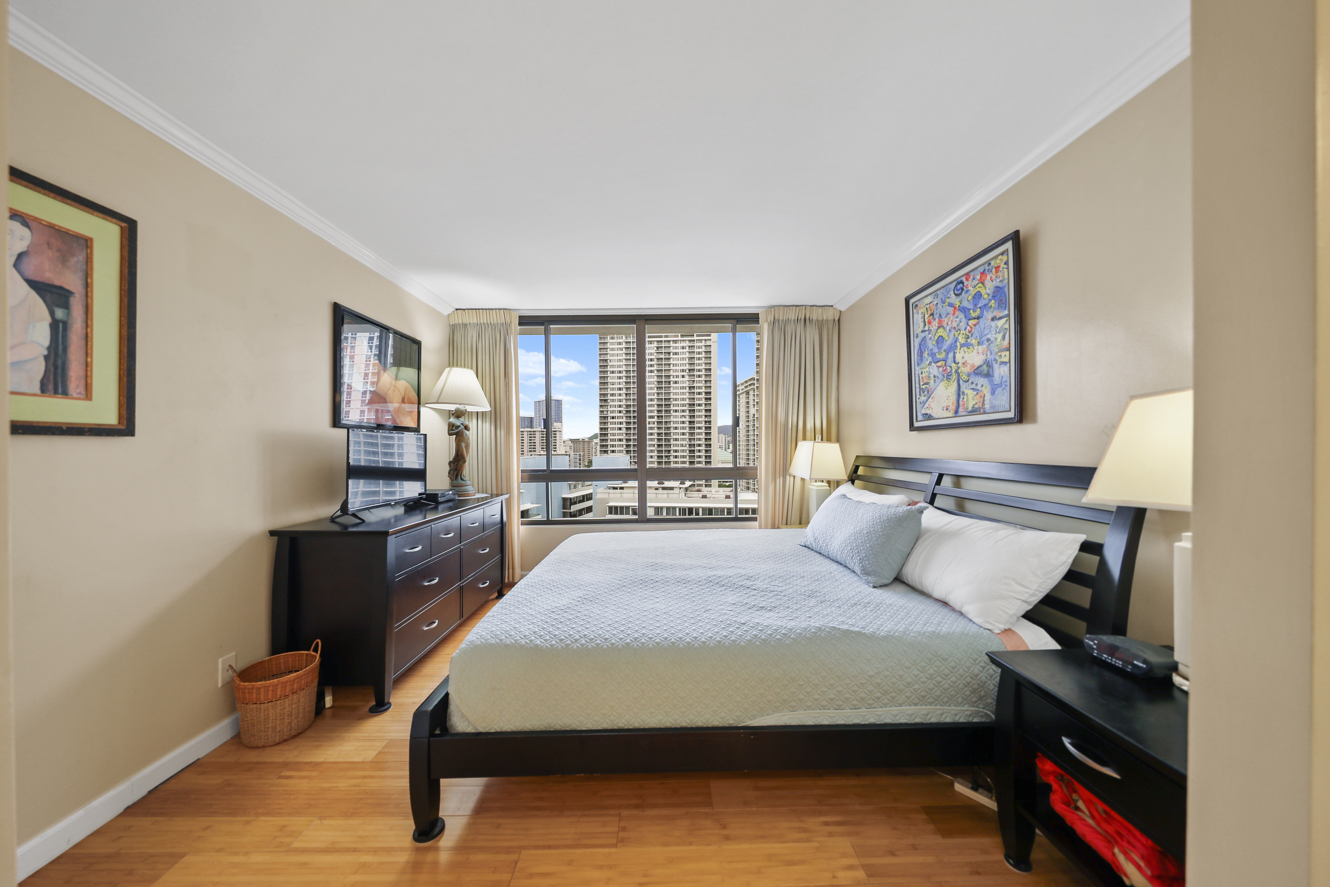 Stop compromising. Residence 18A at Canterbury Place is the Waikiki unicorn you have been waiting for, featuring 2 rare covered parking stalls and a pet-friendly policy with NO weight limit. This is not just a condo; it is a house in the sky. The floor plan has been masterfully opened up to maximize flow, showcasing rich bamboo hardwood flooring, custom crown molding, and a modern, bright kitchen. Perfect elevation offers a warm, intimate connection to the lush greenery of DeRussy Park, Diamond Head, sparkling ocean glimpses, and an unbeatable view of the Friday Night Fireworks from your spacious, covered lanai. Smart buyers will love the all-inclusive maintenance fee covering Central AC, Electricity, Cable, Internet, and Water. Enjoy resort-style amenities including a heated pool, jacuzzi, sauna, BBQ and party room, and pickleball court. Perfectly positioned at the gateway to Waikiki, you are steps from luxury dining, famous shopping centers, lively entertainment and world renowned sandy beach parks. Fee Simple and furnishings are negotiable which can make this turn-key ready. This is the perfect balance of luxury, utility, and location. BONUS: building allows 30 days minimum rental.